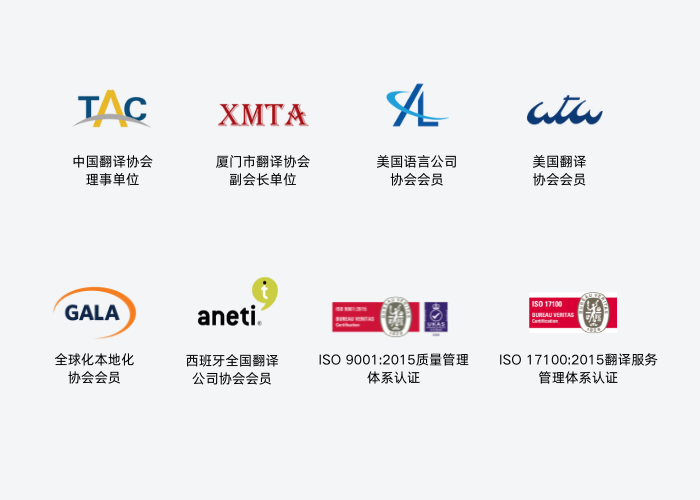 公司拥有专家型的经营管理团队,遵循严格规范的服务流程,执行符合国际标准的质量管理体系。公司于2010年通过ISO 9001:2008质量管理体系认证,先后获得中国首批“翻译服务诚信单位”、厦门市思明区先进单位等荣誉;2012年,公司荣获中国翻译协会优秀单位会员称号。公司是中国翻译协会理事单位,厦门翻译协会副会长单位,美国翻译协会(ATA)、美国语言服务行业协会(ALC)等国际行业机构的会员。
